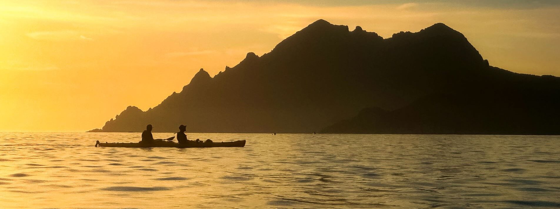Kajakfahrer an Küste bei Sonnenuntergang